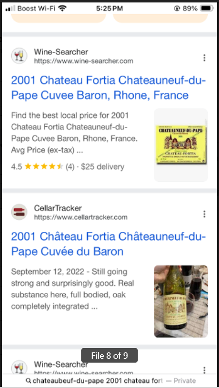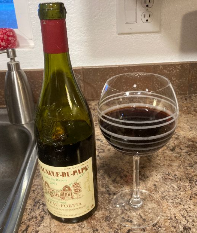 11-15-25 – This page is posted to thank Jim and Stephanie Holzemer for one of the finest anniversary gifts one can ever get – a bottle of the finest wine in history – Chateauneuf-du-Pape. Enjoy the pictures below and know that I opened this bottle before I learned it could be worth $2000. But that is OK, I just had a glass of the wine I have grown to love all because Jim and Stephanie gave me the finest wine they could find 21 years ago. And Darlene and I were amazed to find that the wine is ALMOST as good as imagine it was then.