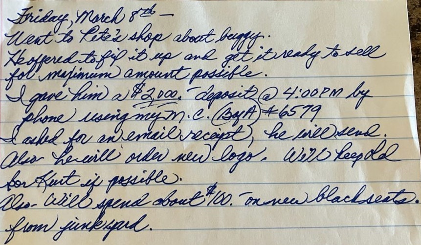 On March 8, 2024, Kurt and Darlene decided to visit the AA shop to confront Pete Briggs and gain possession of the buggy as the time to make the repairs was taking too long and the engine had been disassembled again, so they were looking to re-establish possession of what they owned and move forward elsewhere with getting the buggy rebuilt to sell on BaT. However, upon face to face discussion at AA, Pete Briggs suddenly had a change of heart (or so the Shafer’s thought). Pete stated he had changed his mind and was willing to work out a situation to assist with getting the buggy rebuilt to a saleable condition to anyone, whether it be BaT or a private party. Pete stated he understood and was experienced in what it takes to get a vehicle prepared to go to auction at BaT and suggested the Shafer’s buggy needed a lot of attention to get it sold on BaT at a healthy price. Pete Briggs told the Shafer’s that if they could come up with some cash to start the process of a makeover, including new paint, repair of existing interior and exterior parts and re-building of the engine, AA and Pete Briggs could deliver a highly functioning, Auctionable asset that would fetch a respectable amount of money on BaT or elsewhere. Pete Briggs stated these things to Kurt and Darlene Shafer while they were present at the AA business location, speaking face to face, and in the company of their son, Ryan Shafer who was present remotely via speaker-phone call with Darlene during the discussion. At the time, Darlene and Ryan believed this was a once in a lifetime opportunity for Kurt Shafer to get the buggy ready for auction at BaT, and advised Kurt to accept AA and Pete Briggs’ offer. Darlene Shafer committed to fronting $2,000 at the request of Pete Briggs to do all of this rebuilding and await any further compensation until the buggy was sold. At the time, Kurt, Darlene, and Ryan (through Darlene) specified expectations as “owners” such as wanting to be party to any major modifications, the use of original equipment to the extent possible and that the buggy be released in ready to drive, reliable, and complete condition upon completion so it could be moved directly with confidence to BaT for immediate sale. Darlene Shafer asked about a “contract” or “formal estimate” of the work AA and Pete Briggs were planning, but Pete Briggs stated, “my word and handshake is as good as any contract” and the Shafer’s shook on it, with the agreement to pay for the engine rebuild and to pay for the rest of the buggy renovation following the sale of the car. Darlene proceeded to deposit $2,000 via credit transaction to AA and Pete Briggs (Transaction Record). It is worth noting that at this time, unbeknownst to the Shafer’s, Pete Briggs had sold the most important and valuable part of Kurt Shafer’s buggy, back in February, to someone else. The Shafer’s (Kurt, Darlene, and Ryan) were unaware of this and were under the impression that the original engine parts (as described in the first paragraph) were still available for rebuilding the engine back into a 2,180cc performance motor. As such, Kurt Shafer continued to prepare for the buggy auction at BaT by providing details of performance, engine specifications, etc.