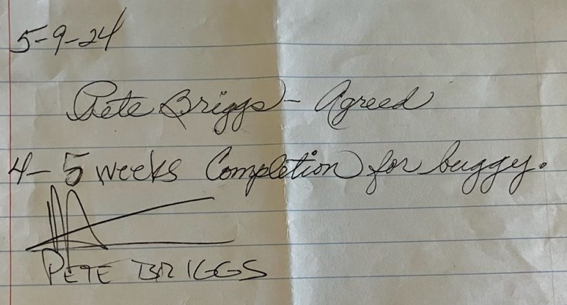 Over the months of April, May, June – Communication was difficult and the buggy was not worked on by AA and Pete Briggs. Darlene Shafer had Pete Briggs sign a completion date agreement dated May 9, 2024. A follow-up agreement was signed by Pete Briggs on June 14, 2024.