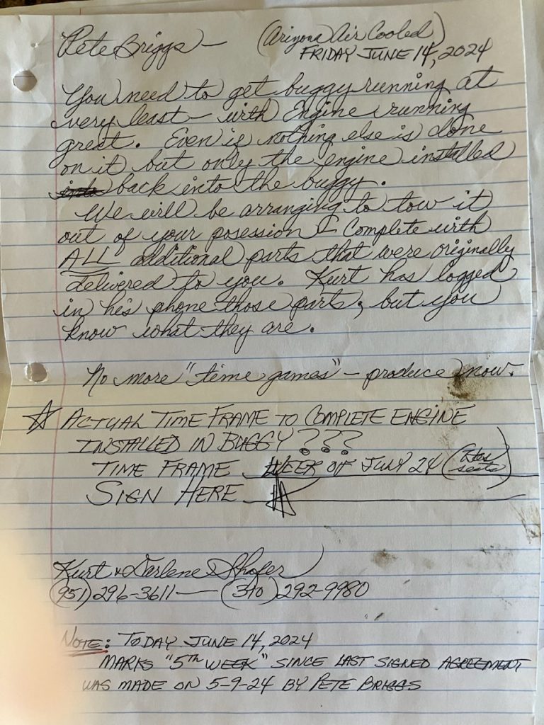 No communication until September 10&11, 2024. Kurt Shafer requested confirmation of the size of the engine in the buggy. There is mounting concern that the engine is NOT the original engine with a new crank and is instead a cobbled together replacement. In a phone conversation between Kurt Shafer and Pete Briggs on September 11, 2024, Pete Briggs says the engine delivered is a 1,915cc engine with stroker crank, that should perform as well as the 2,180cc engine. THIS WAS THE FIRST ADMISSION BY PETE BRIGGS THAT HE DID NOT REBUILD THE EXISTING ENGINE AND THAT THE ENGINE WAS NOT A DIRECT REPAIR OR REPLACEMENT OF THE ORIGINAL ENGINE.