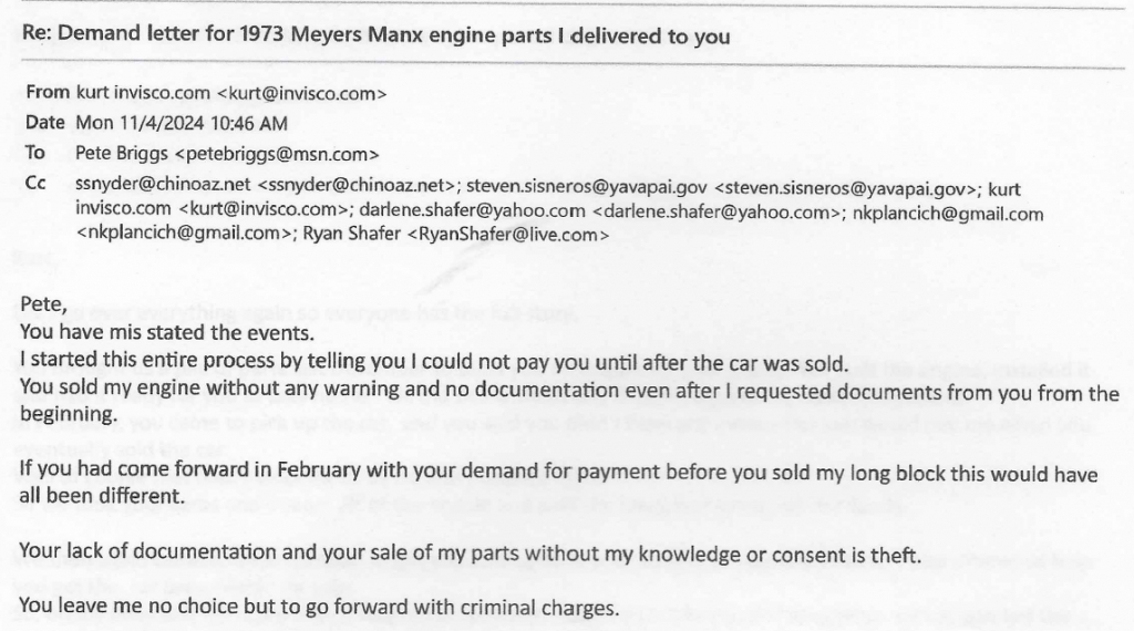 In December 2024, and without payment from Kurt Shafer, AA and Pete Briggs rebuilt the original engine (According to AA and Pete Briggs e-mail November 4, 2024) with Kurt Shafer’s parts and with new parts purchased ($1,500 crank) and general engine rebuild components. AA and Pete Briggs did not provide an itemized list of parts, did not log the parts received from Kurt Shafer, and did not submit an invoice request for payment to Kurt Shafer, however text and e-mails suggest that the crank was replaced. In conversations via text, Kurt and AA and Pete Briggs concluded that mounting the engine onto the rolling chassis of the buggy ($500 cost) would help Kurt to move toward selling the buggy and getting the needed cash, and so it was completed by AA and Pete Briggs. This was completed in February 2024. On February 21, 2024 (e-mail Kurt Shafer to Family) Kurt Shafer indicated that in conversation with Pete Briggs, Pete was in need of cash and claimed he needed $2,000 to cover the engine rebuild and installation cost before releasing the buggy to Kurt to be sold on BaT. Kurt Shafer said that Pete Briggs and he had agreed to wait until the buggy sold to receive payment of $2,500. AA and Pete Briggs would not release the buggy to Kurt Shafer until they received monetary compensation for the engine rebuild. This was the beginning of AA and Pete Briggs very poor decision making, which led to the eventual devaluing of the buggy, loss of income to both parties, and theft of Kurt Shafer’s property and asset(s). AA and Pete Briggs, without formal contract, without itemized detail, and without securing funding from Kurt Shafer, rebuilt the engine then asked for payment, which Kurt had already confirmed was not possible. AA and Pete Briggs proceeded to hold the buggy at AA with the rebuilt engine.