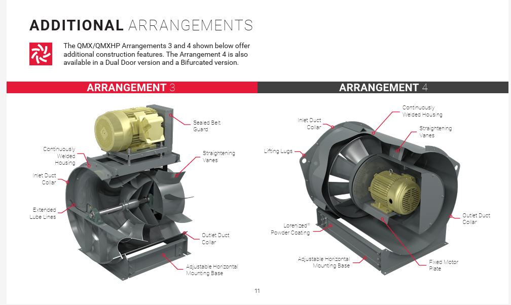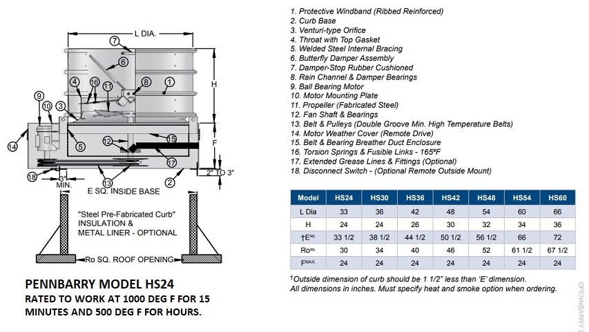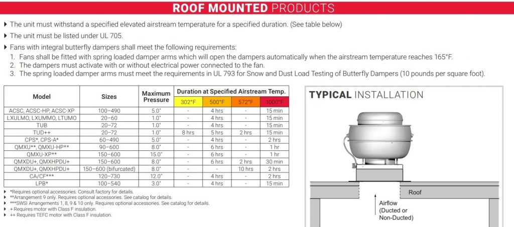 I reviewed the state of the art in fire rated rooftop ventilators and I found that most of them use belts to allow the motor to be outside of the hot air flow. And I learned that the LorenCook QMXU smoke ventilator can pull 8000 CFM in 1.25 inches of static pressure but it take 4.8 HP to do it! Their application engineer, Ben, said the product data sheet does not show power curves so he relies on software to give him that data.