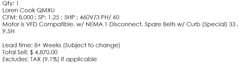 Loren Cook has many models. Here is their 8000 CFM model – note they need 5 HP! That is at 750 watts per HP or over 3500 watts.