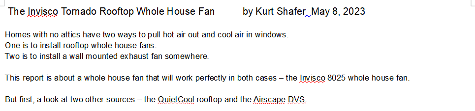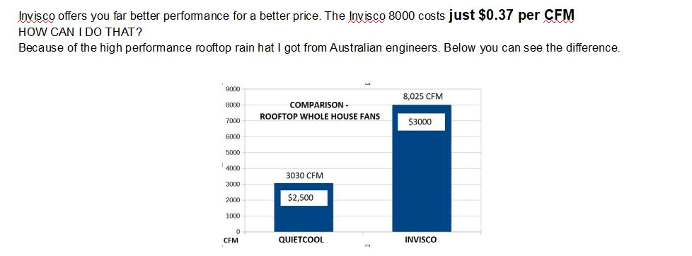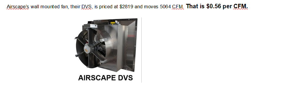 The rooftop is also useful as a wall unit if you prefer to avoid work on your roof. There is only one other wall mounted whole house fan source in America – Airscape. Here is the DVS- Note it is 5064 CFM at a price of $2,929 for a 10 speed unit. The Invisco 8005 CFM roof or wall system is $3,750 for infinitely variable speeds. Airscape is $0.58 per CFM, Invisco is $0.47 per CFM